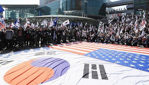 当地时间17日下午,韩国保守团体成员聚集在京畿道水原市的一处公园内,呼吁无罪释放前总统朴槿惠,巨幅星条旗铺地格外亮眼。主办方称,有1万人参加这次太极旗集会。据报道,当地派出800多名警察维持现场秩序。当天没有伤亡发生,但期间警民多有摩擦。 韩国《京仁日报》称,此次集会由大韩爱国党和“千万人无罪释放总部”组织发起。报道说,主办方特意挑选地方选举之前举行集会,是为了凝聚保守势力。据悉,韩国将于6月13日进行全国范围的地方选举,届时各地区的行政代表将会产生。 据报道,在下午2点集会正式开始之前,参会群众还举行了庆典活动。下午3点半后,集会结束,转而进行街头游行。 呼吁释放朴槿惠的集会中为何会出现美国国旗?早前,韩国纽西斯通讯社援引韩国庆熙大学教授李泽光的话称,“对参与集会的保守民众来说,手持太极旗和星条旗没有太大区别,都是守护国家的象征,因为在朝鲜战争中是美国拯救了韩国”,“美国类似于韩国的救世主,这种冷战思维已铭刻在保守民众心中”。 朴槿惠自去年3月底被捕后一直关押在拘留所。4月初,韩国法院将对朴槿惠“干政门”相关案件进行一审宣判,对此检方提请判处30年监禁。