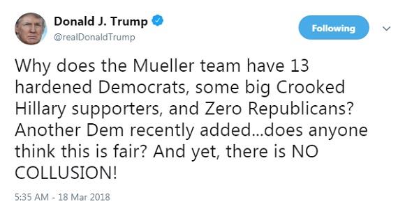 但美国媒体指出,特朗普的推特忽略了一些事实。虽然调查团队有不少民主党人,但穆勒本人是一名共和党人,而且在通俄门调查开始以来,并不能说没有犯罪,因为先后有19人受到刑事指控。包括特朗普前竞选经理马纳福特(Paul Manafort)等。 周一一早,似乎意犹未尽的特朗普再次发飙:“整个一个‘政治迫害’ ,全是利益冲突。”