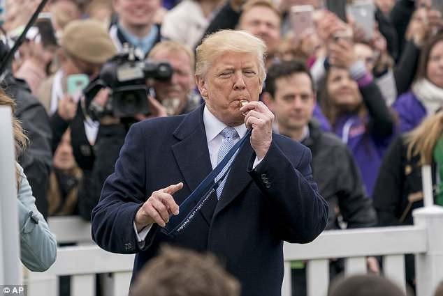总统川普星期一在白宫复活节“滚蛋”活动上吹哨。(美联社图)
