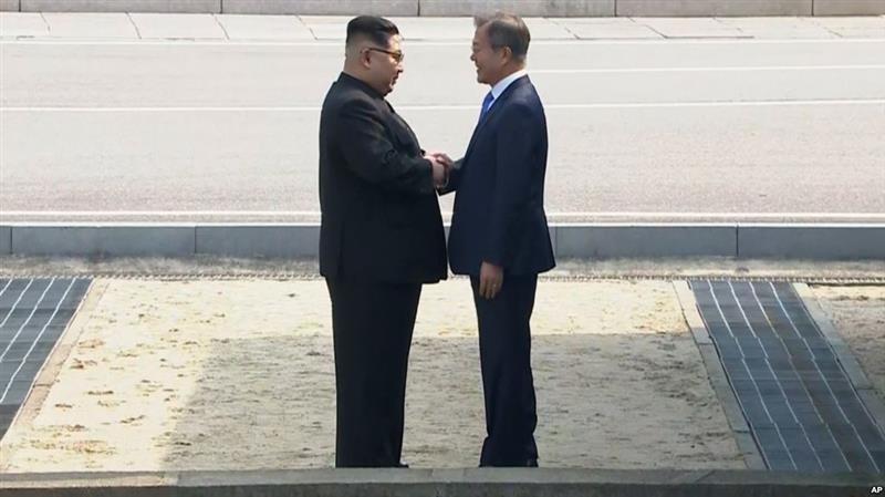 韩国总统文在寅和朝鲜领导人金正恩在非军事区握手