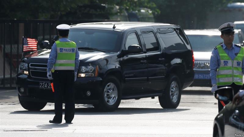美中经贸磋商结束后,美国官员乘车离开美国驻华使馆(2018年5月4日路透社)