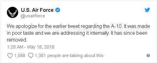 这则视频配有不长的文字说明:“在#阿富汗#法拉省,在阿富汗领导的攻势发起之后,塔利班武装分子仓皇逃窜。视频显示美国空中武力(MQ-9s)的支持。”这则视频发布在驻阿富汗美军的官方账户上。随后的视频显示了更多的塔利班分子在惊慌奔逃,但未能成功躲避空袭。 五角大楼星期三公布了这段不同寻常地直白呈现暴力的视频。美国、北约和阿富汗政府军为了法拉省首府法拉市的控制权,正在与塔利班激战。法拉省毗邻伊朗。 不到24个小时后,美国空军在与阿富汗有关的空军推特账户上发的一条推也让一些人感到惊诧。这条推把网上窜红的一段音频引为典故。在这个音频中,人们因为某个字的发音究竟是“laurel”还是 “yanny”展开了激烈而友好的争论。 空军的推文夸口说:“在#阿富汗法拉市的塔利班武装宁愿听到#Yanny或#Laurel而不是我们的#A10攻击机前来拜访的#BRRT声。” 几个小后,空军道歉了,并说这条推文“格调低”,已被删除。