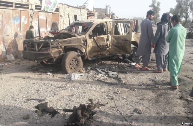 居民们在观看阿富汗政府军与塔利班在法拉省交战后一辆被摧毁的军车。(2018年5月16日)