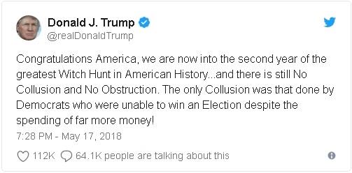 川普总统在推特上说:“祝贺美国,我们现在进入了美国历史上最大猎巫的第二年。还是没有查出勾结,没有查出妨碍司法。唯一有勾结行为的是民主党人,他们虽然花了多得多的钱,却赢不了选举。” 但是星期三,川普总统任命的联邦调查局局长克里斯托弗·雷在一次国会听证会上说,他不认为穆勒的调查是“猎巫”。“猎巫”一词源自欧洲近代和北美殖民地时期发生的追查巫婆和巫术的风潮,现在用来形容捕风捉影的政治迫害。川普喜欢用“猎巫”一词来贬损涉俄调查。 穆勒的调查仍在继续,目前看不出调查很快将要结束的任何暗示。