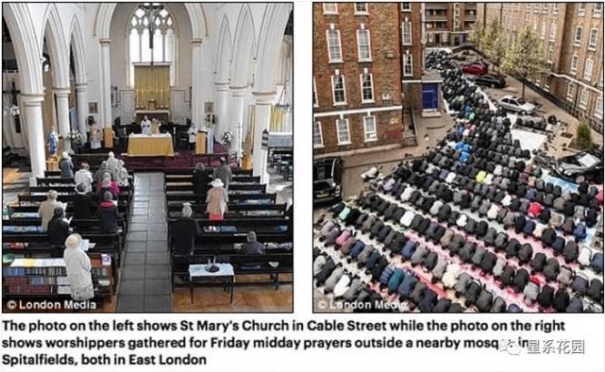 图为英国教堂里寥寥无几的本地人 与大街上占道跪拜的大批穆斯林的对比 英国人现在被指责为 不列颠·布雷克斯形势下的仇外者 但如果这类讨伐遛狗的小册子 表明英国人的生活方式 真的受到这些新住户的挑战 那么英国人目前表达出的那些情绪 应当是可以理解的