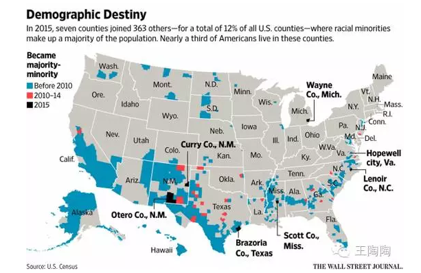 过去白人为主的美国人口稳定结构,即将全面瓦解。2016年6月,《华尔街日报》报纸援引最近最新一次人口普查的结果称,按人口年龄来看,在55岁以上的美国人中有3/4为白人,在18至34岁美国人中白人仅占56%,在未成年中甚至低于50%;从地域来看,全美36个州和华盛顿哥伦比亚特区的370个县非拉丁裔白人人口不到全国总人口的一半。这些地区包括德克萨斯州沃思堡和奥斯汀市、北卡罗来纳州的夏洛特市、佐治亚州的萨凡纳市、加利福尼亚州的萨克拉门托市等大型城市。