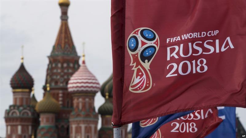 2018年6月4日,俄罗斯莫斯科,圣巴索大教堂旁边,带有2018年世界杯标志的旗帜飘扬。