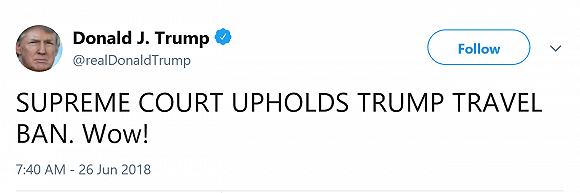 6月26日,示威者在美国华盛顿最高法院门口抗议旅行禁令。图片来源:视觉中国 当地时间周二(6月26日)上午,美国联邦最高法院以5比4的投票结果判决维持特朗普颁布的旅行禁令——限制来自伊朗、利比亚、索马里、叙利亚、也门、朝鲜和委内瑞拉这七国的访客入境美国。 在特朗普去年1月就任总统后,美国政府先后三次发布旅行禁令,以国家安全为由禁止部分中东国家的访客入境。不过此前的禁令都被法院叫停。此次最高法院所支持的是特朗普去年9月签署的第三版旅行禁令。在旧版的基础上,这份禁令删掉了苏丹,又增加了针对朝鲜、乍得、委内瑞拉三个国家访客的限制,但乍得随后被剔除。 在最高法院宣布决定后,特朗普立即在推特上用大写字母激动地表示:“最高法院支持特朗普的旅行禁令,哇哦!”