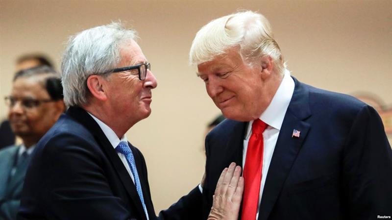 欧盟委员会主席容克(左)与川普总统2017年7月8日在20国集团工作会议前见面交谈
