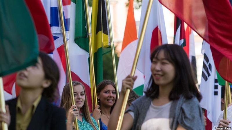 国际学生举着代表他们自己国家的国旗参加美国密苏里州立大学毕业典礼。