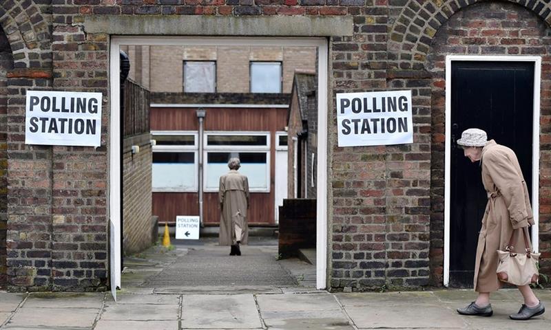 Two women enter a polling station to vote in the EU referendum in London. Photograph: Hannah Mckay/EPA