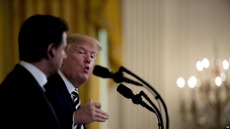 川普总统在与意大利总理孔特在白宫联合举行的记者会上讲话。(2018年7月30日)
