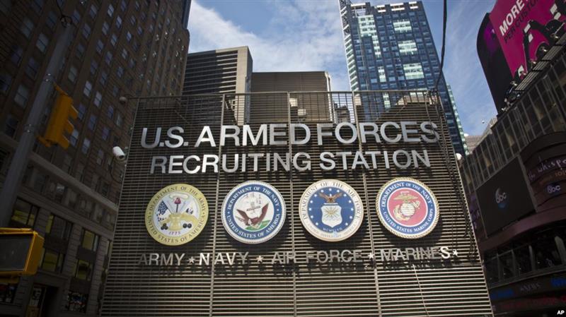 纽约时报广场的美国陆军、海军、空军和海军陆战队联合招兵站 - 资料照片
