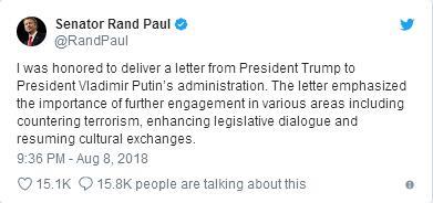 美国共和党参议员兰德·保罗向俄政府转交特朗普信件。(图源:美媒) 海外网8月9日电美国共和党参议员兰德·保罗8日晚间发布推文称,他已向俄罗斯政府转交了美国总统特朗普的信件。不过,对于信件属性,白宫与保罗的说法不一。 综合美国有线电视新闻网(CNN)、路透社等外媒报道,保罗在推文中强调这封信向俄方提出在不同领域合作,他说,“我有幸将特朗普总统的信件转交给普京总统的政府。信件强调美俄在反恐、议会间对话等方面进一步接触的重要性,还提议恢复美俄文化交流。” 然而,白宫表示,这封信不过是特朗普替保罗访莫斯科写的推荐信。白宫发言人霍根·吉得利(Hogan Gidley)发表声明称,“在参议院保罗的要求下,特朗普提供了一封推荐信。特朗普在信中提到了保罗想与普京讨论的话题。”