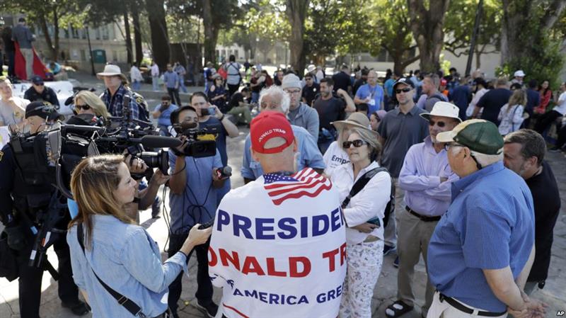 在加州伯克利一次自由言论集会上,支持和反对川普的民众当面辩论。(2017年8月27日)
