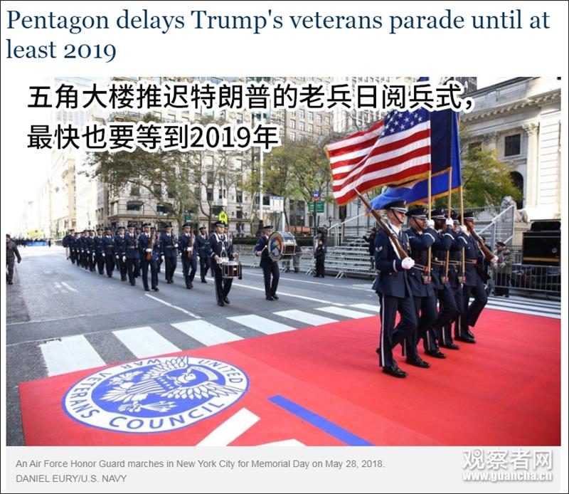 据美军半官方报纸《星条旗报》报道,五角大楼发言人罗伯∙曼宁(Rob Manning)于当地时间16日表示,原定于今年“双11”美国退伍军人日当天举行的阅兵式,不会在2018年内举行。美国军方和白宫现已同意将在2019年寻找机会举办。