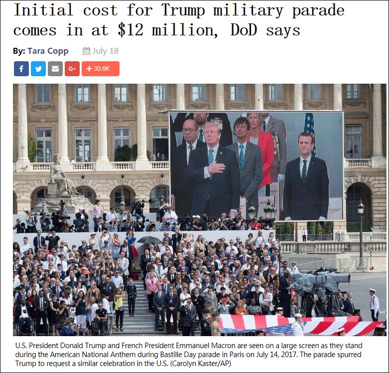 《星条旗报》报道截图 CNBC报道称,罗伯∙曼宁发布的声明中称,美国防部和白宫一直计划举行阅兵式,来纪念美国退伍军人,同时纪念第一次世界大战100周年。“我们原本计划在今年11月11日举行的阅兵式,现在已同意在2019年另寻机会举办”。 在美国防部发布推迟阅兵式消息后几小时,美联社援引美官员的话称,最新预估特朗普渴望的“大阅兵”将耗资约9200万美元(约6.3亿元人民币),是白宫早前估计费用的3倍。 CNBC报道称,而这比上月美国防部预估的阅兵成本费用高出了8000万美元。