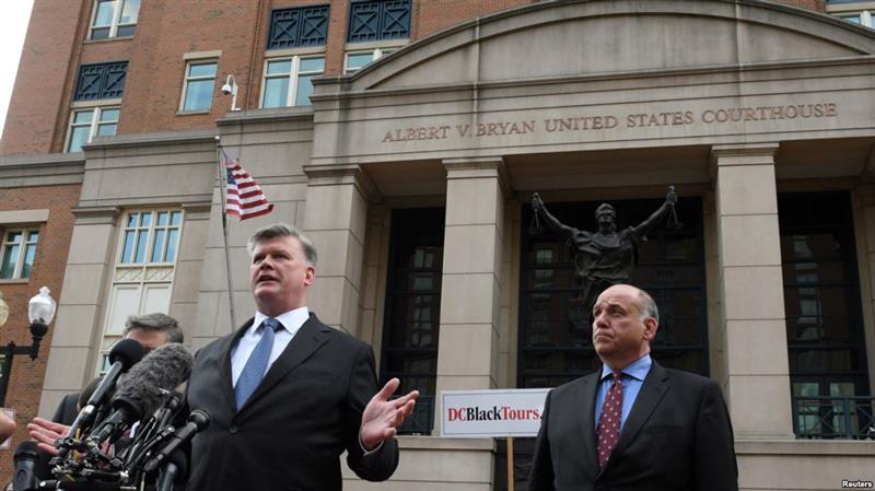 前川普竞选主席保罗·马纳福特审判宣读判决后,辩护律师查理·韦斯特林(麦克风后),凯文·唐宁和托马斯·泽恩在美国地方法院前向媒体发表讲话。维吉尼亚州,亚历桑德里亚,2018年8月21日。