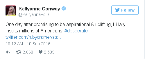 Democratic presidential nominee Hillary Clinton caused an uproar late Friday after telling a fundraiser audience that half of Republican nominee Donald Trump's supporters could be described as part of a "basket of deplorables." The former secretary of state, who described her own remarks as "grossly generalistic", said Trump had bolstered people who are "racist, sexist, homophobic, xenophobic, Islamophobic, you name it." She did add that Trump's other supporters are frustrated by hard times and merit sympathy. "They are just desparate for change," Clinton said. "They don't buy everything [Trump] says, but he seems to hold out some hope that their lives will be different. Clinton was speaking at an LGBT fundraiser in New York City, where she encouraged supporters to "stage an intervention" if they have friends considering voting for the Republican nominee. "That may be one conversion therapy I'd endorse," said Clinton, referring to a type of counseling designed to urge gay, lesbian, bisexual or transgender children to change their sexual orientation. The Democratic nominee later clarified that she wants to end the practice. Singer Barbra Streisand, who performed at the fundraiser, altered the lyrics of the Stephen Sondheim song "Send In The Clowns" to mock Trump, referring to the real estate mogul as a "sad, vulgar clown." Trump campaign manager Kellyanne Conway responded to Clinton's remarks on Twitter late Friday.
