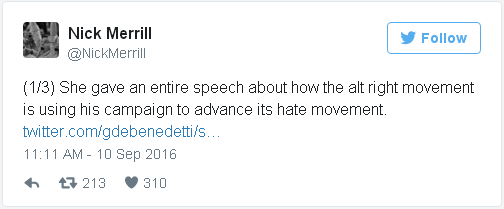 Clinton campaign spokesman Nick Merrill defended the candidate in tweets of his own. "Obviously not everyone supporting Trump is part of the alt-right, but alt-right leaders are with Trump," Merrill added. "And their supporters appear to make up half his crowd when you observe the tone of his events. The fundraiser capped a day during which Trump again attacked Clinton's credibility. He said Clinton was being "protected" during the Justice Department's investigation into her use of a private email server while secretary of state. "She could walk right into this arena right now and shoot somebody with 20,000 people watching, right smack in the middle of the heart, and she wouldn't be prosecuted," Trump said at a rally in Pensacola, Fla. Trump also faced criticism from within his own party for refusing to outline his plans for combating foreign policy challenges, including threats posed by ISIS. Trump said this week that he does indeed have a plan, but would convene military leaders in his first 30 days in office to craft another plan. Trump has also faced criticism for praising Russian President Vladimir Putin during a high-profile national security forum earlier in the week, and appearing on a Russian-backed television network Thursday evening. On Friday, Clinton said she was "disappointed" by Trump's decision to appear on RT America, saying that "every day that goes by this just becomes more and more of a reality television show. It's not a serious presidential campaign." With several prominent Republican national security officials already concerned about Trump's national security acumen, Clinton has tried to cast herself as the better potential commander in chief. She has aggressively promoted her growing list of military endorsements from both parties. On Friday, her campaign said the number of retired generals and admirals endorsing Clinton for president has grown to 110. Trump quickly countered by saying his list had ballooned to 120 former U.S. generals and admirals earlier in the week. Trump's running mate, Indiana Gov. Mike Pence, received his first intelligence briefing Friday. The vice presidential nominee declined to offer any specifics since the information was classified.