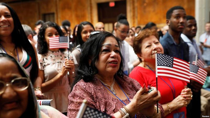 美国新移民在纽约曼哈顿公共图书馆参加入籍宣誓仪式。(2018年7月3日)