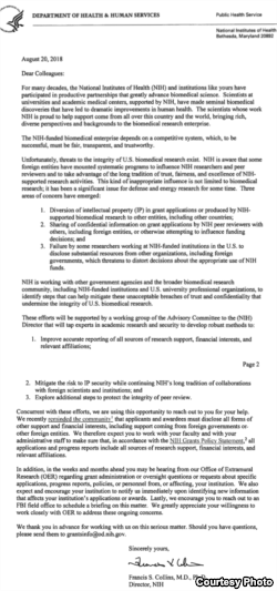 美国最大的医学科研机构、国立卫生研究院(NIH)院长弗朗西斯·柯林斯(Francis S. Collins)写信给大约10000个NIH资助的机构,要求他们明确披露各种形式的支持和资金来源,包括来自其他外国政府和外国机构的支持。 8月20日,美国最大的医学科研机构、国家卫生研究院(NIH)院长弗朗西斯·柯林斯(Francis S. Collins)写信给大约10000个NIH资助的机构,要求他们明确披露各种形式的支持和资金来源,包括来自其他外国政府和外国机构的支持。在信的最后,柯林斯鼓励这些机构与FBI的地方办公室联系,讨论知识产权和外国干预的威胁。 柯林斯在信中说,“不幸地是,对美国生物医学研究的威胁确实存在。” 他写道:“NIH意识到一些外国实体机构建立了系统的项目,影响NIH的研究者和同行评审。” 除此之外,国家卫生研究院院长顾问委员会还了成立工作小组专门负责处理外国对研究独立性的影响。 柯林斯的这封信遭到了原北京大学生命科学院长饶毅的批评。饶毅在给柯林斯的一封公开信说,柯林斯“所谓美国生物医学研究面临威胁的信令人震惊,因为这是和平时期第一次政府官员限制科学交流”,“你的信和你鼓励FBI调查的行动,大大偏离了科学实践的常轨。” 国家卫生研究院公关部在给美国之音的电子邮件中说, 柯林斯院长只是希望减少对知识产权和安全构成的威胁,但同时保持国立研究院与外部的合作,包括与外国科学家和研究机构的合作。 这封邮件还认为饶毅误解了柯林斯的意图。