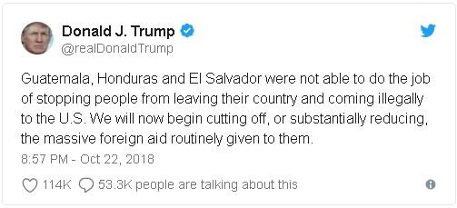 目前离全美范围的国会选举还有两个星期的时间。身为共和党人的美国总统特朗普把最新涌向美国南部边界的移民潮归咎于对立的民主党人。 特朗普说:“每次你看到一支移民大军,或者说非法前来或试图非法进入我们国家的人,就要想到并且责怪民主党人没有给我们足够的票数来修改我们可悲的移民法律!记住中期选举!对那些合法来美的人如此不公!”