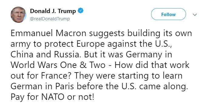 “马克龙建议建立自己的军队来保护欧洲对抗美国、中国和俄罗斯。但在一战和二战德国入侵时,法国军队带来了怎样的结果呢?他们在美国人赶去前已经开始学德语了。赶紧给北约付军费!” 川普随后又连发数条推特继续向马克龙开炮。他说:“问题在于马克龙在法国的支持率非常低,只有26%,而失业率几乎达到10%。他是在转移话题。”川普在几天前刚刚赞扬了他的朋友马克龙,星期二的猛烈抨击着实有些令人惊讶。