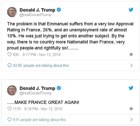 特朗普经常攻击美国在北大西洋公约组织中的盟友,理由北约没有达到2024年的目标,也就是各成员国2%的国民经济必须投入到国防,主要是武器和武装部队。北约是西方在第二次世界大战后建立的主要防务联盟。 目前,29个北约国家中有八个国家实现了2%的目标。 法国国防开支占其国内生产总值的1.82%,但巴黎已宣布计划在2025年前逐步增加军费以达到北约目标。相比之下,世界最大经济实体美国在19.4万亿美元的经济总量中有3.1%为国防开支。 特朗普宣称自己是“民族主义者”,拥有“美国优先”的国际关系观。 但是,在周日巴黎第一次世界大战结束一百周年之际,在特朗普坐在旁边聆听时,马克龙批评了世界各地不断抬头的民族主义,并宣称民族主义是对“爱国主义的背叛” 。 特朗普周二反驳道,“问题在于,伊曼纽尔在法国的支持率非常低,26%,失业率几乎达10%。他只是试图转换主题。顺便说一下,没有国家比法国更民族主义,他们是非常自豪的人,这也是理所当然的!让法国再次伟大!”