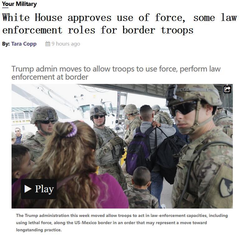 《军事时报》报道截图 该命令容许军人采取他们认为所必须的防卫行动,以便保障边防部门工作人员的安全。 上述措施包括开枪、人群控制、临时拘留以及简短搜查。 据《新闻周刊》获得的文件显示,特朗普总统签署了一份更早前的“决定备忘录”,内容与“内阁备忘录”中的建议相同。 美国国防部此前曾宣布打算在南部边境部署7000名士兵。特朗普表示,他将向该地区派兵1.5万人。此外,美南部边境现有2100名国民警卫队军人。 目前数个移民(专题)队正在墨西哥境内前进,这主要是来自洪都拉斯的人。他们的目标是抵达美墨边界,并试图进入美国领土。据最新数据,目前墨边境城市蒂华纳和墨西卡利附近聚集的移民人数达5600人。