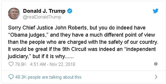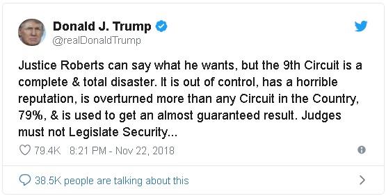 他的推文说:“罗伯茨大法官想怎么说都可以,但是第九巡回法院完全是灾难。它失控了,声名狼藉,裁决推翻率超过国内任何巡回法院,达78%,并用来获得几乎能保证的判决。法官们绝不能在安全问题上行使立法之责。”