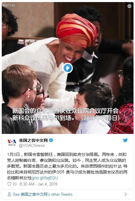华盛顿 — 第116届美国国会2019年1月3日正式上任,一共有10位新科参议员和100新科众议员宣誓就职。这批在去年11月国会中期选举中胜出的新成员也创下了多项新纪录,成为了美国国会史上种族最多元,女性成员最多的一代新国会。 平均年龄最低、女性新成员最多 110位新科参众新议员包括了66名民主党人和44名共和党人,其平均年龄只有49岁,是最近3次选举结果中最年轻的一届。其中备受关注的就是代表纽约州第14选区,现年只有29岁的新科众议员欧加修-寇蒂兹(Rep. Alexandria Ocasio-Cortez, D-NY。 她是国会史上最年轻的女议员。欧加修-寇蒂兹在2018年民主党内初选中击败党内大老克劳利(Joe Crowley)成为国会议员候选人时震撼美国政坛,现在她也成为本届新国会美国媒体瞩目焦点之一。 2018年被称为“女性的一年”,参与美国政治选举的女性人数创下纪录。2019年展开的国会中,一共有42位女性新成员宣誓就职。民主党在众议院能成功拿下多数控制权与其中期选举女性候选人创下新高亦有密不可分的关联。在民主党成功翻盘共和党的众议院选战中,超过60%的席位由女性夺下。62名民主党新科众议员里有35位女性,共和党37名新科众议员中只有2名女性。 另外,3名新科民主党参议员皆为女性,包括来自内华达州的罗森(Sen. Jacky Rosen, D-NV)、亚利桑那州的辛尼玛(Sen. Kyrsten Sinema, D-AZ)和明尼苏达州的史密斯(Sen. Tina Smith, D-MN);与此同时,共和党虽然新增了7名新科参议员,但女性仅占两名,分别为田纳西州的布莱克本(Sen. Marsha Blackburn, R-TN)以及密西西比州的海德-史密斯(Sen. Cindy Hyde-Smith, R-MS)。 接替参议院外交委员会主席科克(Bob Corker)位置的布莱克本参议员同时也是田纳西州首位女性参议员。 在新成员加入国会后,众议院目前有102名女性议员,参议院则有25位女性议员