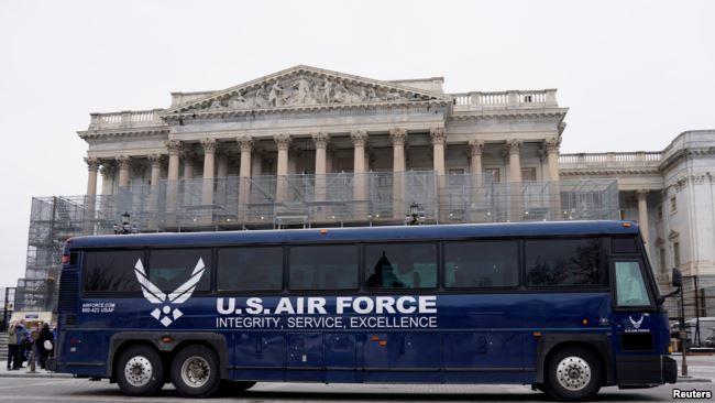 一辆准备把众议院议长佩洛西和其他国会代表团成员送往机场的美国空军大巴等候在国会大厦外。(2019年1月17日)