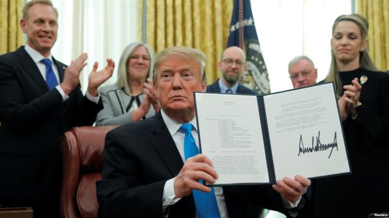 美国总统特朗普在白宫椭圆形办公室展示了“第4号航天政策令”。(2019年2月19日)