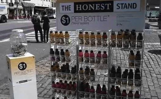 当美国人在街头放了一个货架和钱箱,人性暴露了 在一个炎热的周五下午,许多到俄亥俄州大都会动物园参观的游客,发现自己面对一道诚实题的选择: 动物园的入口处摆放着许多无人看管的瓶装冷饮,只有一个投币箱,上写“每瓶一美元,请将钱投入钱箱”。 由于无人看管,游客可以选择付钱,也可以不付钱,吃霸王饮料的人不必担心承担任何法律责任(调查人员在隐蔽处观察记录每个人的特征)。