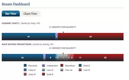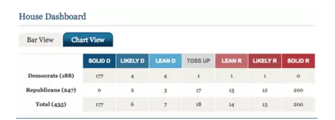 Cook Partisan Voting Index(库克党派投票指数,以下简称CPVI)根据过去八年一个每个选区在各类选举中的投票分布测量一个选区的党派倾向。根据这一指数,现在共和党控制的众议院247席中,有5席倾向民主党,17席难以预料,25席倾向共和党,200席是共和党的稳固席位。这意味着共和党很有可能丢掉5席,最坏的情况甚至会丢掉22席。而反观民主党现在掌握的188席中,只有2席倾向共和党,1席难以预料。这意味着民主党将在众议院中收复一些失地。