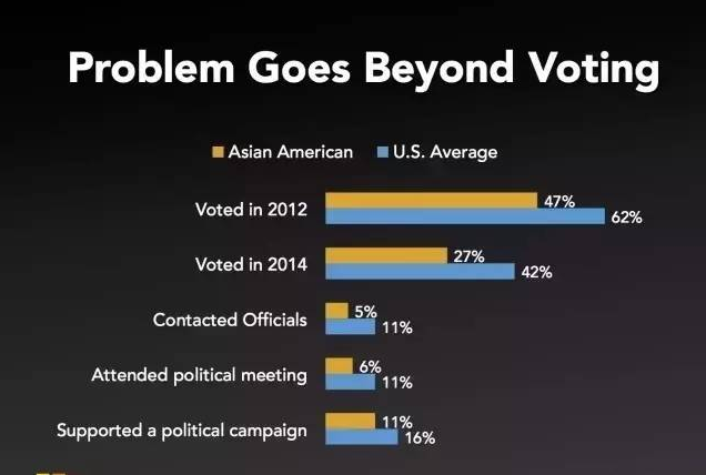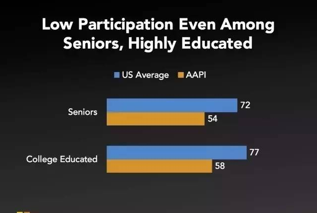 资深亚裔人口的参与度为54%,而全美平均水平是72%,低了18个百分点;高学历亚裔的参与度是58%,而全美平均水平为77%,低了19个百分点。