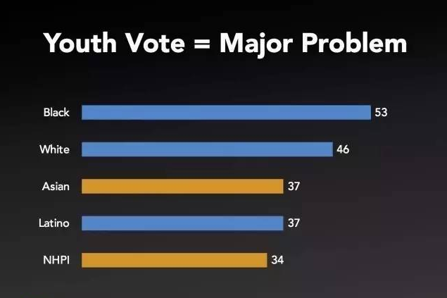 R教授认为,青少年是我们的未来,伴随越来越多的亚裔孩子在美国本土出生,青年的投票率成为一个关键问题(见下图):2012年大选中,亚裔青年投票率仅有37%,与拉丁裔并列倒数第二,比非裔青年投票率低了16个百分点,比白人青年投票率低了9个百分点。