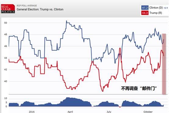 受“邮件门”调查重启影响,特朗普支持率曾于11月1日反超希拉里,为自5月来首次。希拉里随后再度追上,上周五的数据显示希拉里以47%领先特朗普45%。
