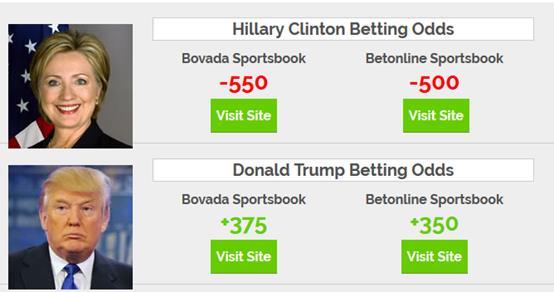 另据美国著名博彩赔率网Bovada和Betonline,希拉里获胜概率分别为84.6%和83.3%;特朗普获胜概率为21.1%和22.2%。