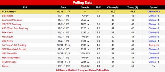 不仅如此,美国RCP的全国平均民调也显示希拉里优势扩大,10月31日至11月7日,希拉里对特朗普的平均领先幅度回升至2.9个百分点。