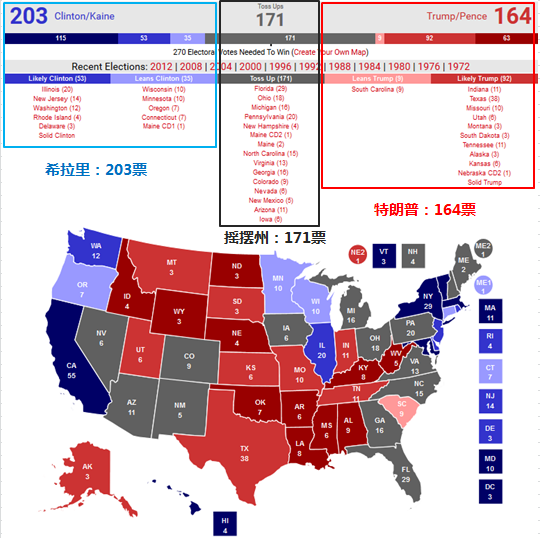 需要格外注意的是,因为在美国投票制中,除缅因及内布拉斯加州以外,其他48州实行“赢者通吃政策”( winner-take-all),即本州的选举人票全部给予在该州获得相对多数普选票的总统候选人。所以,只要希拉里能够拿下佛罗里达州、宾夕法尼亚州等几个摇摆州,就稳操胜券了。