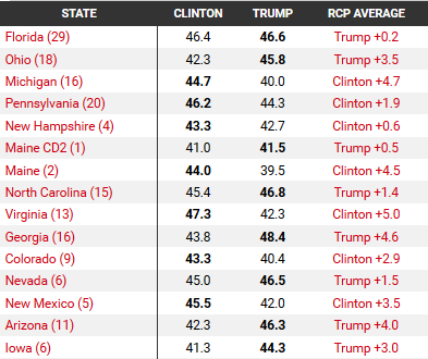 下面是民调显示的希拉里和特朗普在几个主要摇摆州的支持率。俄亥俄州特朗普支持率领先3.5个百分点。