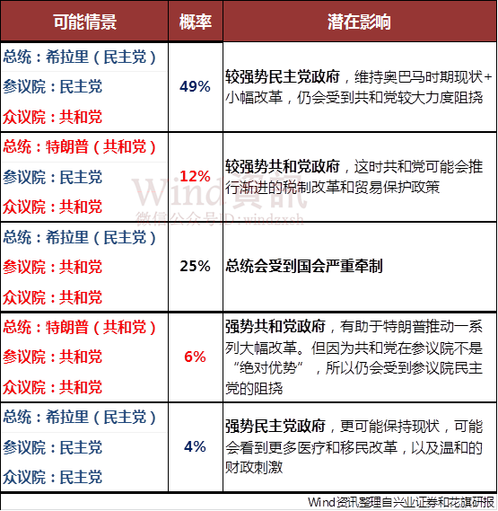 如果希拉里当选,而共和党控制了参众两院中的至少一个,那么希拉里上调个人所得税以及立法限制药物价格的想法获得通过的可能性就要小很多。美国利率也可能更长时间保持低位(大规模财政支出可能性更低),从而利好于高股息率股票。