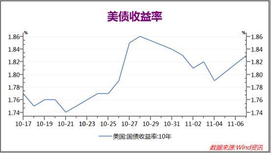 大选在即,美国10年期国债收益率报1.83 %。自11月6日 FBI宣布不建议就“邮件门”起诉希拉里后,收益率回升。