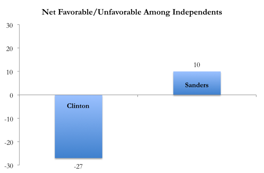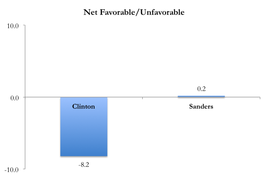 One widely used indicator of a candidate's prospects in a general election is "favorability" (i.e. the proportion of respondents who report "favorable" as opposed to "unfavorable" views of the candidate). In an average of different polls on this question compiled by Real Clear Politics, voters reported unfavorable views of Hillary Clinton by a margin of over 8 percent (42.8 favorable v. 51.0 percent unfavorable). Sanders, in contrast, had a very narrow positive rating (38.4 percent v. 38.2 percent). In general, social scientists believe that going into an election with over 50 percent "unfavorable" places the candidates in a precarious position.