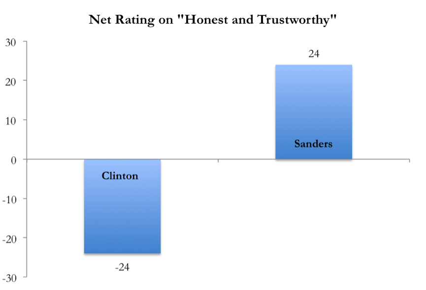 Beneath Secretary Clinton's problematic favorability ratings lies a deep reservoir of public mistrust. When prospective voters are asked whether or not she is "honest and trustworthy," their response is sobering; her rating on this dimension is a net negative 24 points, with 60 percent answering no and 36 percent answering yes. The contrast with Senator Sanders is striking in that it is precisely the opposite: a net positive of 24 percent, with 55 percent responding yes and 24 percent no. Though voters have in the past sometimes supported candidates not known for their honesty and trustworthiness (Richard Nixon comes to mind), a deficit on this quality is a not inconsiderable liability.