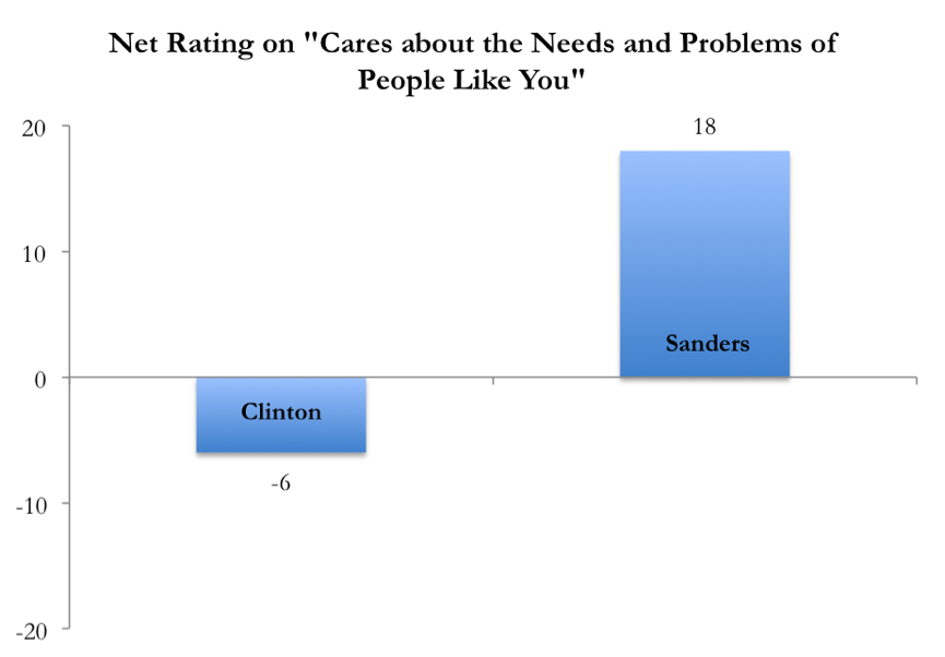 Another revealing question sometimes asked by pollsters--and one that traditionally favors Democrats -- is whether the candidate "cares about the needs and problems of people like you." Surprisingly, a narrow majority of respondents answered in the negative when asked about Secretary Clinton (51 to 45 percent). But Senator Sanders enjoyed a clear majority answering in the affirmative, 53 to 35 percent: a net positive of 18 percent, compared to a net negative of 6 percent for Secretary Clinton. For Democrats, whose comparative advantage resides in good part in the popular belief that they are more concerned about the needs and problems of ordinary people than the Republicans, this is a worrisome finding.