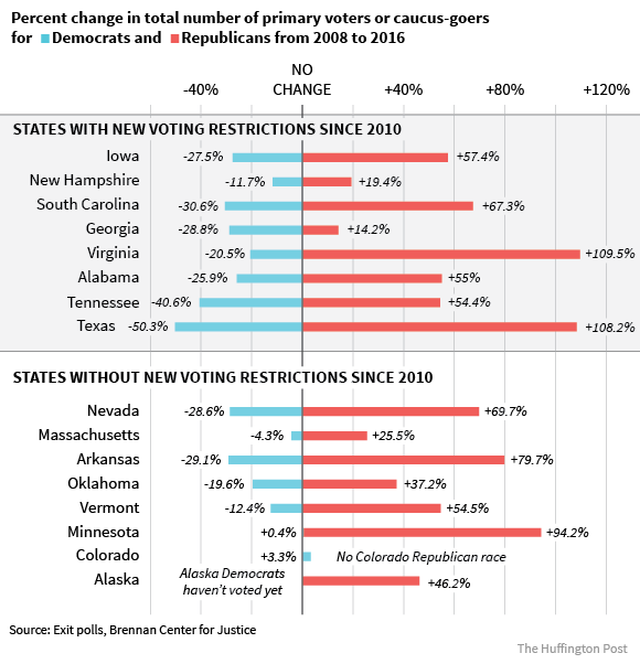 Eight out of the 16 states that have held primaries or caucuses so far have implemented new voter ID or other restrictive voting laws since 2010. Democratic turnout has dropped 37 percent overall in those eight states, but just 13 percent in the states that didn't enact new voter restrictions. To put it another way, Democratic voter turnout was 285 percent worse in states with new voter ID laws.