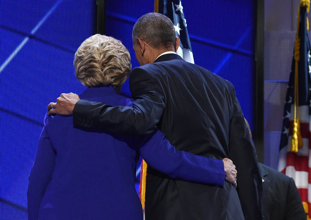 Obama’s speech brought the partisan crowd to its feet ― and the roars grew louder when Clinton made her dramatic, if predictable, entrance onstage to join him. The two exchanged words, embraced and then stood on the stage soaking in the applause as the convention’s third night drew to a close.